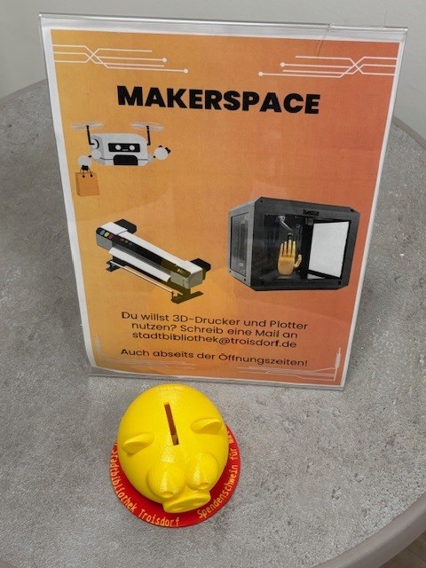 Drei kleine Spendenschweine sammeln mittlerweile in der Stadtbibliothek kleine Geldspenden für den Förderverein der Stadtbibliothek Troisdorf. Spendenschwein Nummer 1 sammelt Spenden von Nutzerinnen und Nutzer der 3D-Drucker, die einen kleinen Obolus für die genutzten Materialien zahlen wollen. Das Spendenschwein selbst stammt aus diesen 3D-Druckern und freut sich, wenn genügend Spenden zusammenkommen, um davon wieder Material für die Drucker anschaffen zu können. Wer gerne den 3D-Druck ausprobieren will, erhält beim Förderverein der Stadtbibliothek unter der E-Mail-Adresse info3d-druck@foerderverein-stadtbibliothek-troisdorf.de Unterstützung.